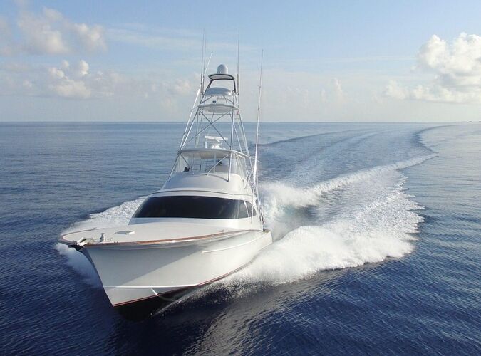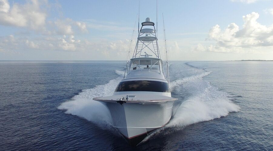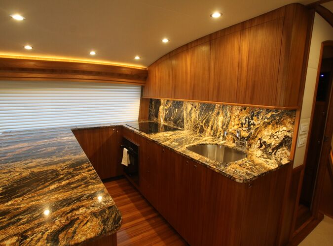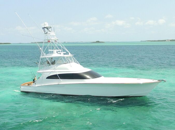 Designed to maximize offshore fishability, owner/guest comfort, and extended stay liveaboard amenities with extensive systems redundancy. Key features include a pair of Onan 29kw gensets, SeaKeeper 26 gyrostabilizer, dual ice maker & water maker capability w/ SpotZero, six (6) exterior stainless lined refrigeration/freezer units, a retracting Furuno commercial sonar unit, and an extensive pressurized baitwell system. Custom curved salon side glass completes the sleek, unmistakable F&S profile. Her four-stateroom and four-head layout offers considerable headroom throughout the boat and is highlighted by a full-beam master suite complete with king size berth. The interior features teak flooring, granite counter tops & granite head flooring (lightweight), custom teak casework and valances, and a contemporary (high ceiling) curved companionway.