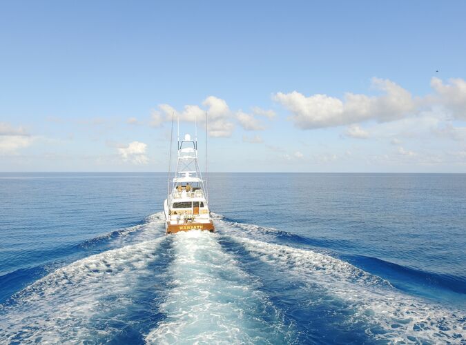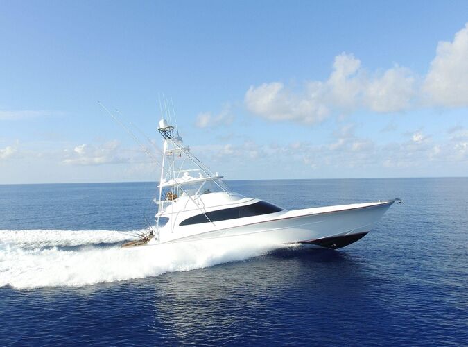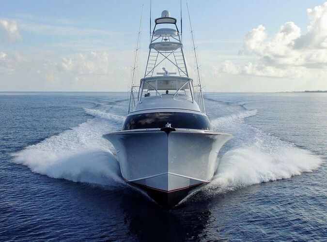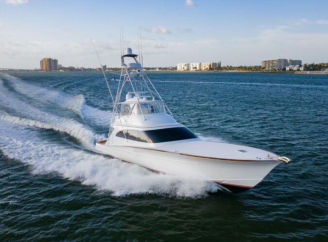 Designed to maximize offshore fishability, owner/guest comfort, and extended stay liveaboard amenities with extensive systems redundancy. Key features include a pair of Onan 29kw gensets, SeaKeeper 26 gyrostabilizer, dual ice maker & water maker capability w/ SpotZero, six (6) exterior stainless lined refrigeration/freezer units, a retracting Furuno commercial sonar unit, and an extensive pressurized baitwell system. Custom curved salon side glass completes the sleek, unmistakable F&S profile. Her four-stateroom and four-head layout offers considerable headroom throughout the boat and is highlighted by a full-beam master suite complete with king size berth. The interior features teak flooring, granite counter tops & granite head flooring (lightweight), custom teak casework and valances, and a contemporary (high ceiling) curved companionway.